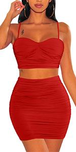 BEAGIMEG Women’s Ruched Cami Crop Top Bodycon Skirt 2 Piece Outfits Dress Red